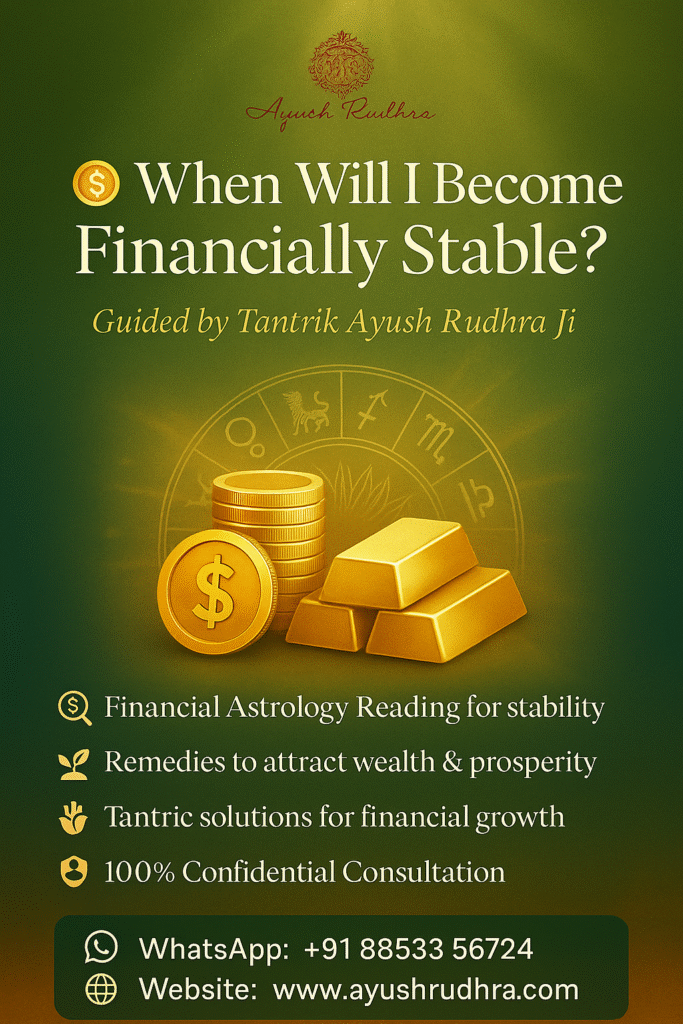 When these planets face doshas (negative influences), financial instability, debt, job loss, or business struggles may occur. That is why the question “When will I become financially stable?” requires a deep astrological reading of your birth chart by an expert like Ayush Rudhra Ji.